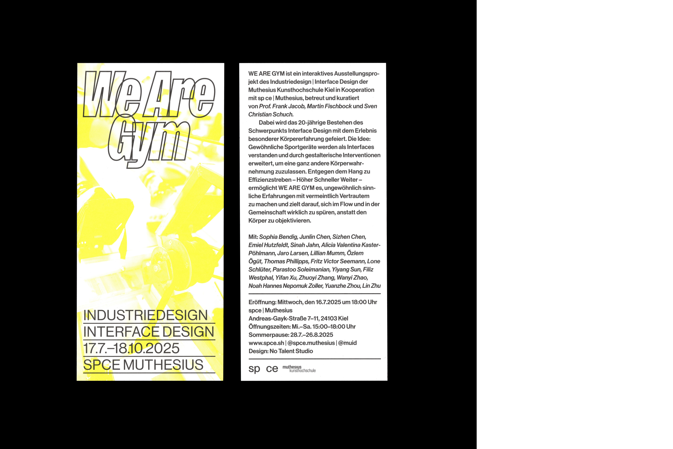 Graphic concept for the exhibition “WE ARE GYM” by the Interface Design program at Muthesius University of Fine Arts and Design in cooperation with sp ce gallery. Photo 4,5 & 8 by Hannes Schlötelburg; 2025